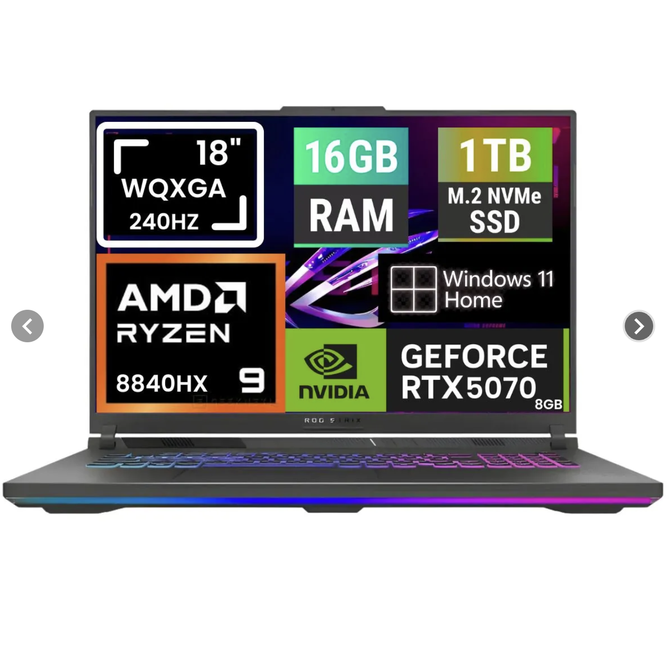 NOTEBOOK ASUS ROG STRIX G18 EXTREME GAMING LAPTOP / MODELO (2025) G814PP-DS94/ PANTALLA 18” WQXGA ( 2560 x 1600 ) 240HZ / PROCESADOR AMD RYZEN 9 8940HX 16 CORES HASTA 5.3GHz / CAPACIDAD DISCO ESTADO SÓLIDO SSD 1TB PCIe 4.0 ( 1000 GIGAS ) (EXPANSIBLE, CONSULTAR) / MEMORIA RAM 16GB DDR5 5600MHz (EXPANSIBLE, CONSULTAR) MÁXIMA VELOCIDAD Y FRECUENCIA DISPONIBLE EN EL MERCADO / PLACA GRÁFICA DE VIDEO DEDICADA NVIDIA GEFORCE RTX 5070 8GB GDDR7 / WINDOWS 11 HOME / COLOR ECLIPSE GRAY / TECLADO RETROILUMINADO RGB